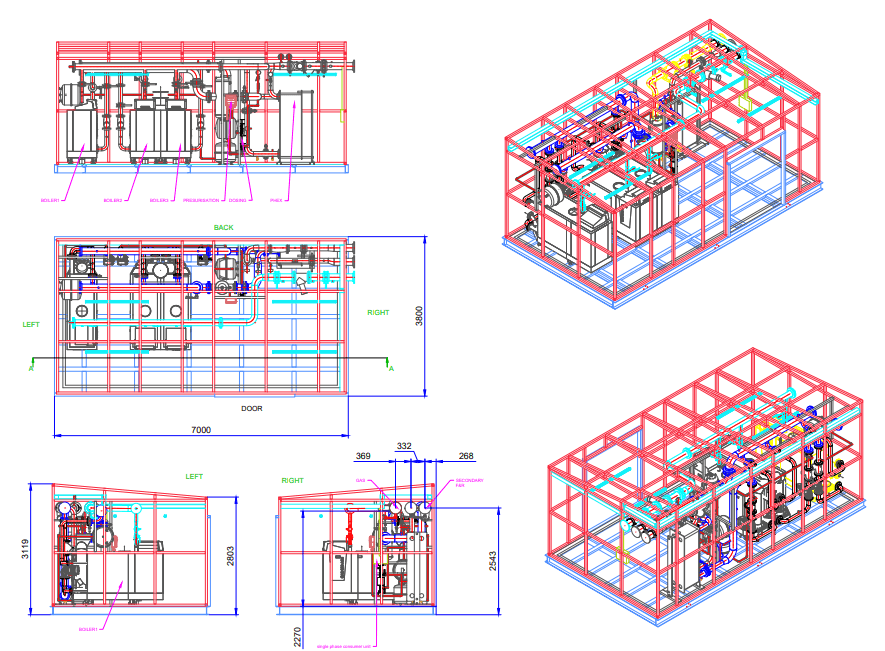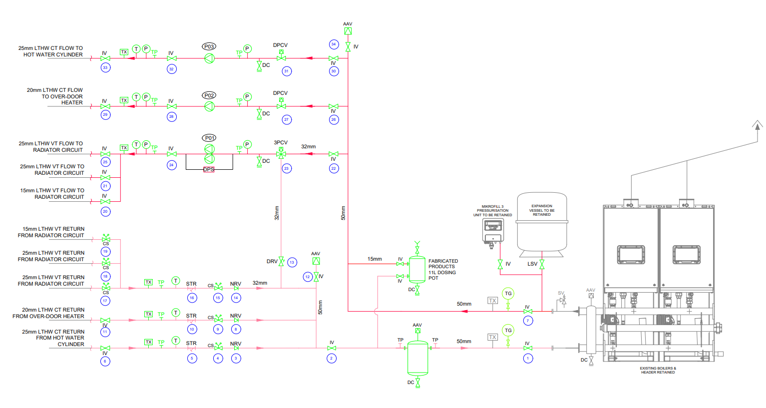 We designed and delivered an externally sited packaged plant room housing two high-efficiency condensing boilers, providing a total output of 1,800 kW. The system incorporates a plate heat exchanger for seamless integration with the existing distribution network, along with all necessary pipework, controls, air/dirt separation, dosing, lighting and power distribution. Space was intentionally built in for future equipment to support the Trust’s net-zero roadmap.
